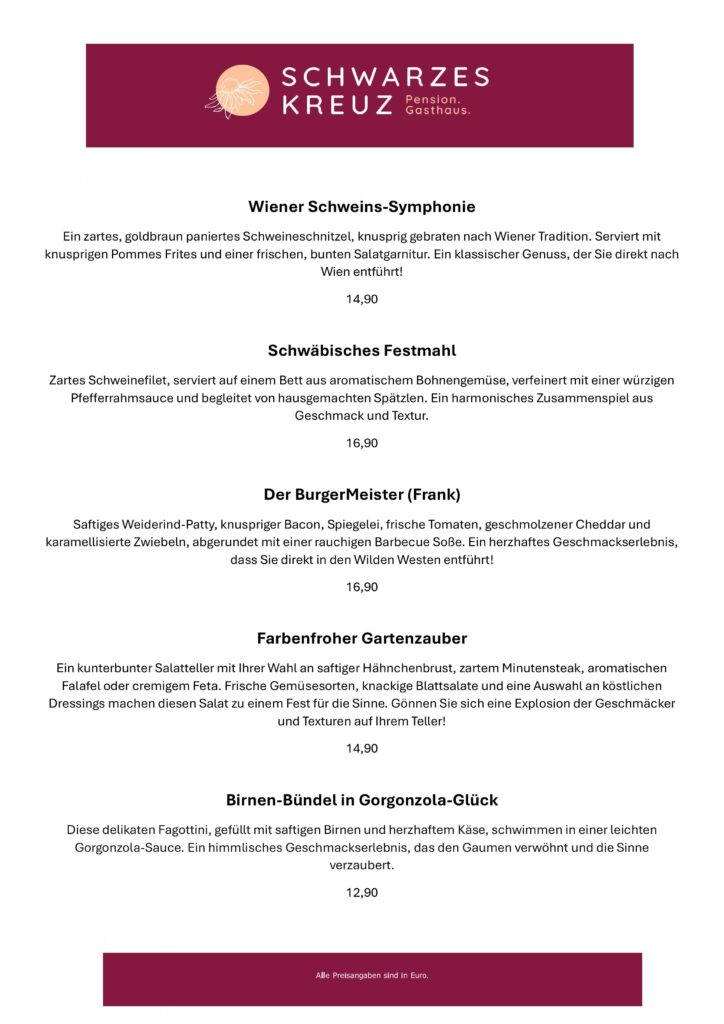 Zartes Schweinefilet, serviert auf einem Bett aus aromatischem Bohnengemüse, verfeinert mit einer würzigen Pfefferrahmsauce und begleitet von hausgemachten Spätzlen. Ein harmonisches Zusammenspiel aus Geschmack und Textur.