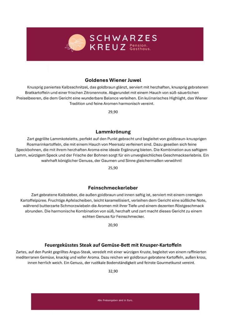 Knusprig paniertes Kalbsschnitzel, das goldbraun glänzt, serviert mit herzhaften, knusprig gebratenen Bratkartoffeln und einer frischen Zitronennote. Abgerundet mit einem Hauch von süß-säuerlichen Preiselbeeren, die dem Gericht eine wunderbare Balance verleihen. Ein kulinarisches Highlight, das Wiener Tradition und feine Aromen harmonisch vereint.